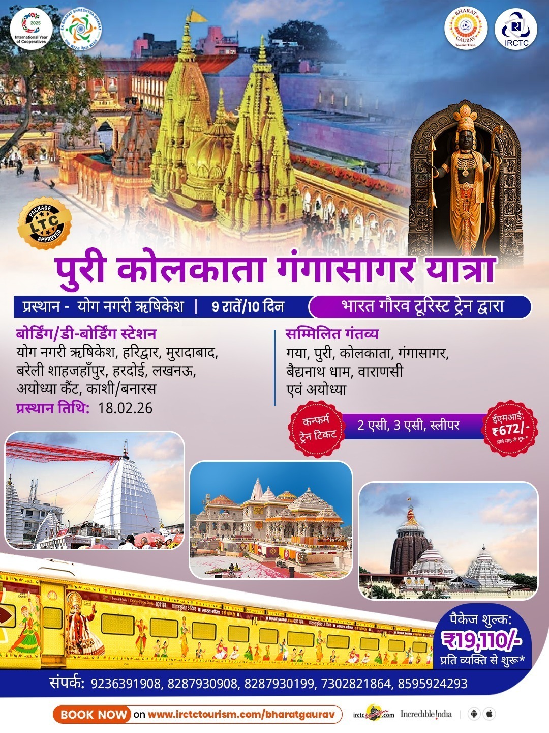 उतरने/चढने के स्टेशन- योगनगरी ऋषिकेश- मुरादाबाद – बरेली – शाहजहॉंपुर – हरदोई- लखनऊ – अयोध्या – बनारस। यात्रा तिथि 18 फरवरी से 27 फरवरी तक 09 रात एवं 10 दिन तक उपलब्ध रहेगी।
