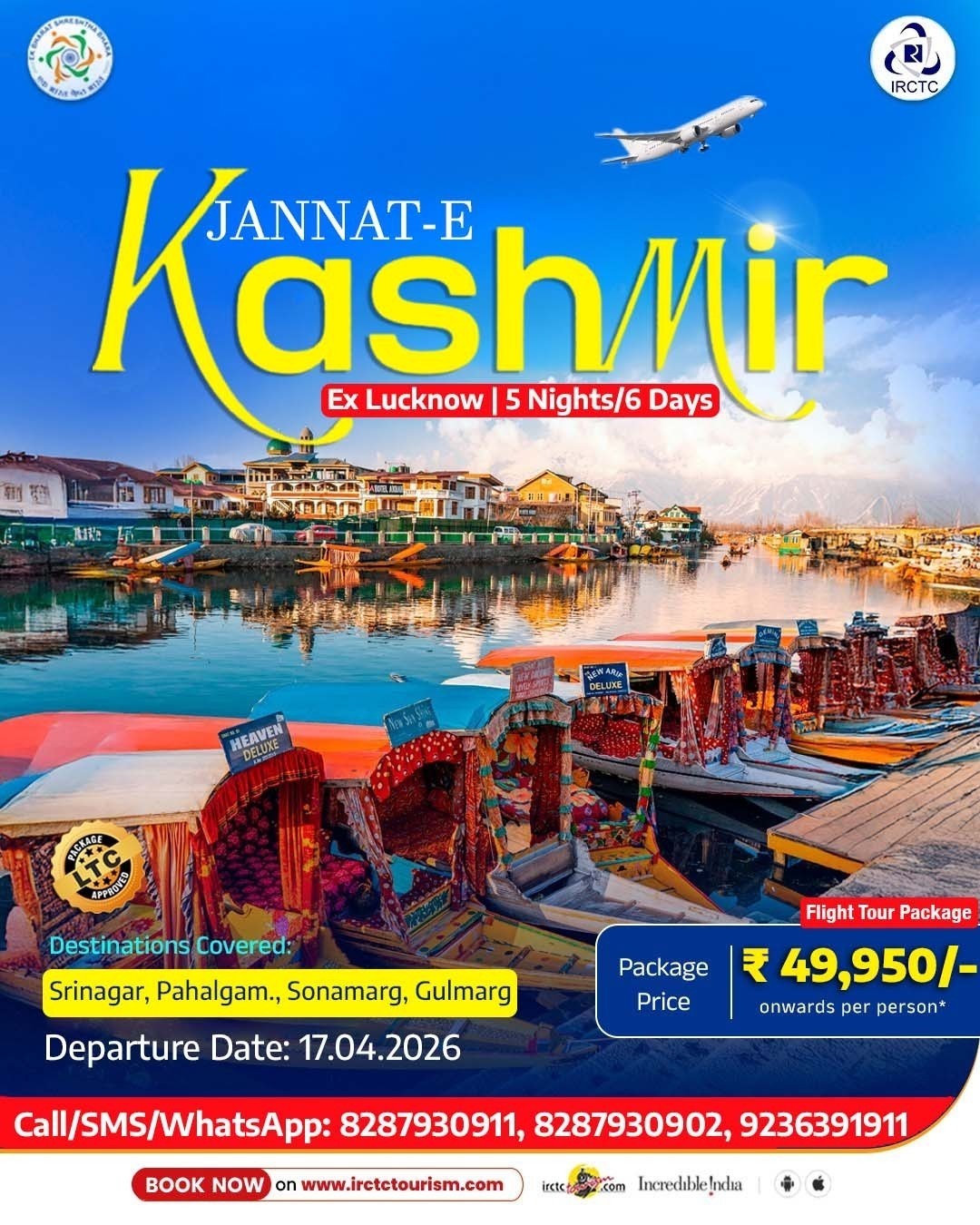 यात्रियों की अधिक मांग को देखते हुए, आईआरसीटीसी क्षेत्रीय कार्यालय लखनऊ से जन्नत-ए-कश्मीर का हवाई टूर पैकेज का संचालन किया जा रहा है।