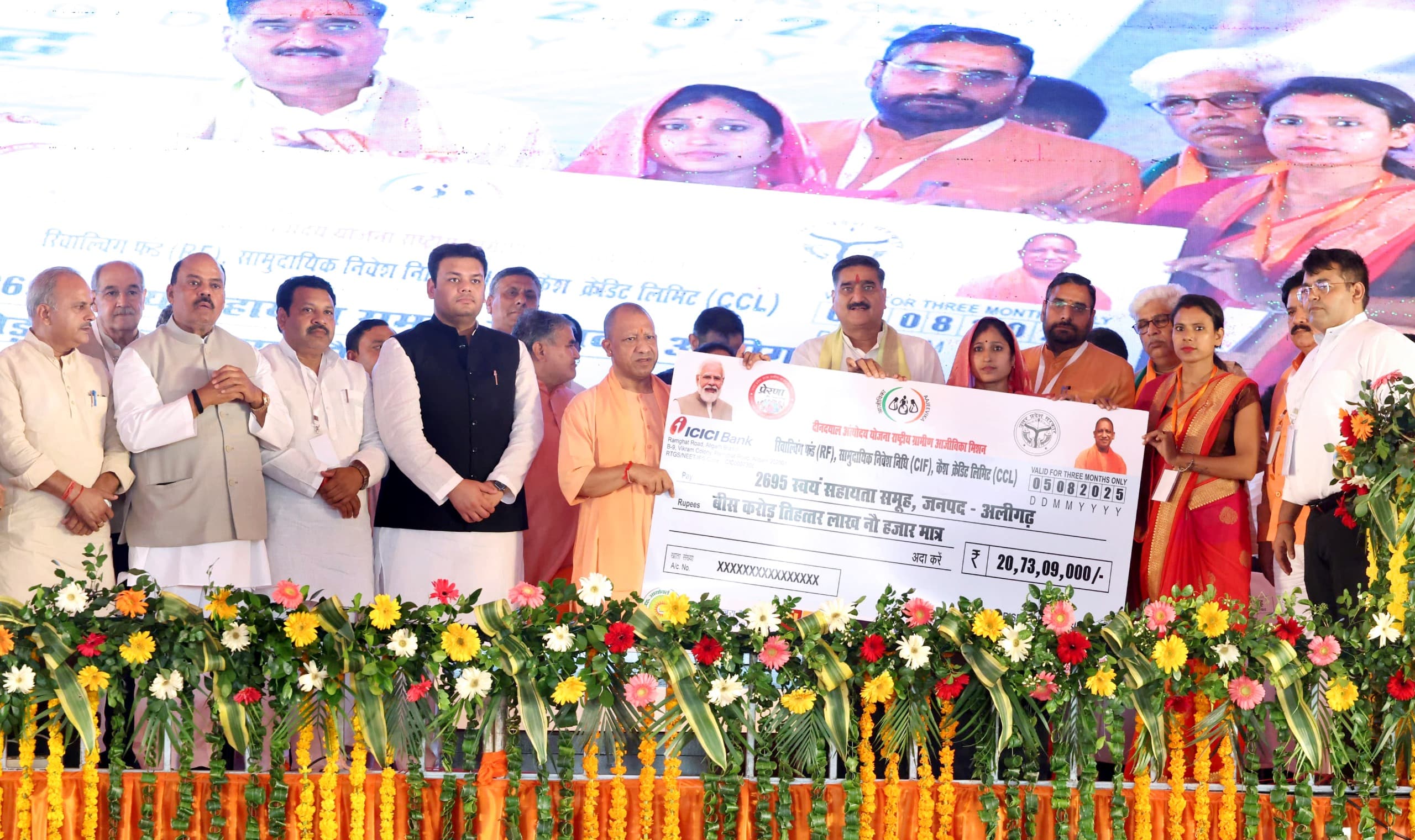 कार्यक्रम में सीएम ने मुख्यमंत्री युवा उद्यमी योजना के तहत लाभार्थियों को चेक वितरित किए। स्वयं सहायता समूहों को आर्थिक सहायता, छात्र-छात्राओं को टैबलेट, पीएम आवास योजना के लाभार्थियों को घरों की चाबियां, आयुष्मान योजना के लाभार्थियों को कार्ड और बच्चों को पोषण किट प्रदान की गई। मंडलायुक्त और जिलाधिकारी ने सीएम को अलीगढ़ के ओडीओपी ताले का प्रतीक भेंटकर सम्मानित किया।