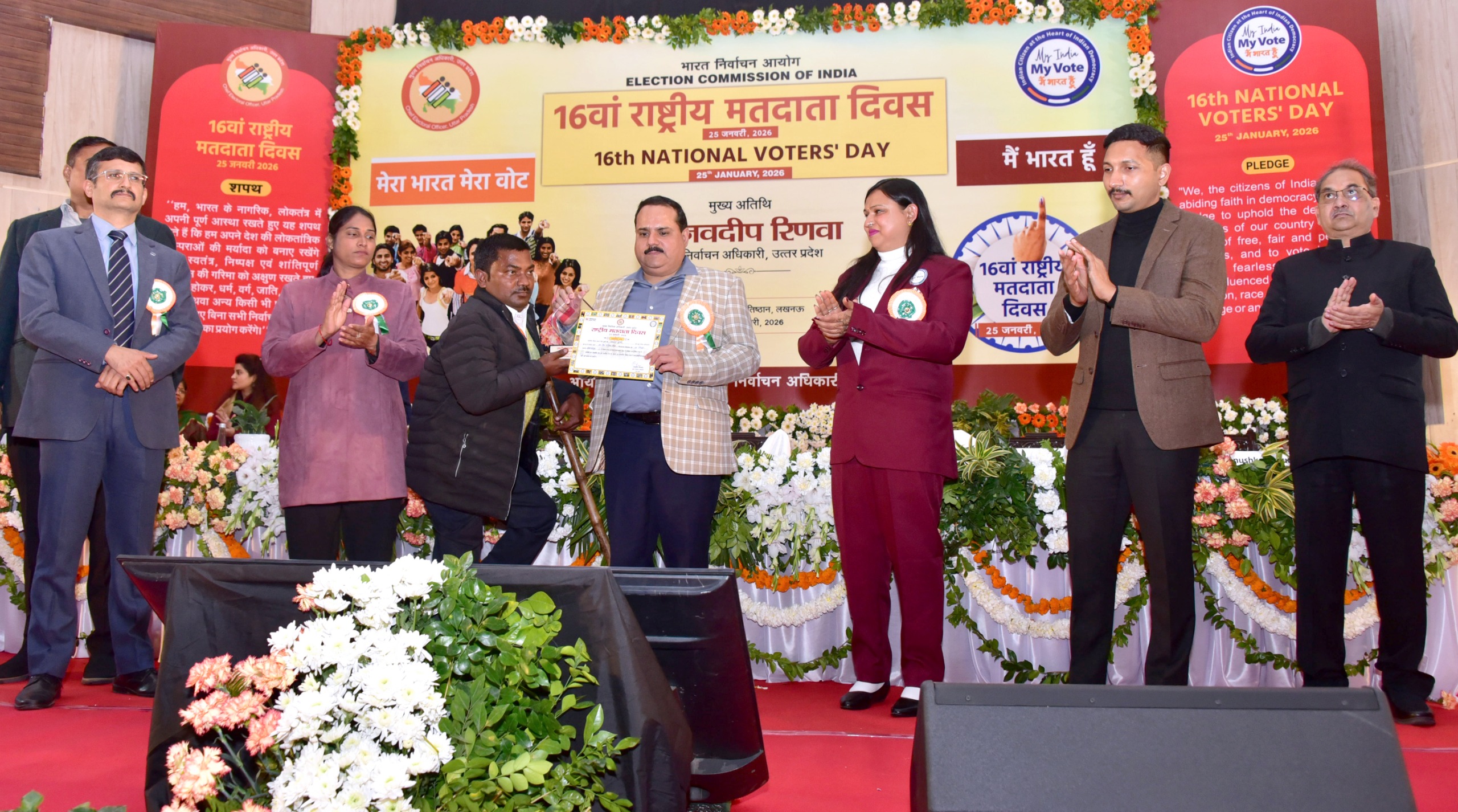 उत्तर प्रदेश में 16वें राष्ट्रीय मतदाता दिवस के अवसर पर राज्य स्तरीय कार्यक्रम राजधानी में आयोजित किया गया। जिसमें मुख्य निर्वाचन अधिकारी नवदीप रिणवा ने मुख्य अतिथि के रूप में सहभागिता कर कार्यक्रम को संबोधित किया। विशिष्ट अतिथि के रूप में मण्डलायुक्त विजय विश्वास पंत, राज्य स्वीप आइकन सुधा सिंह एवं अनुष्का चौबे, जिला निर्वाचन अधिकारी विशाख जी मौजूद रहे।